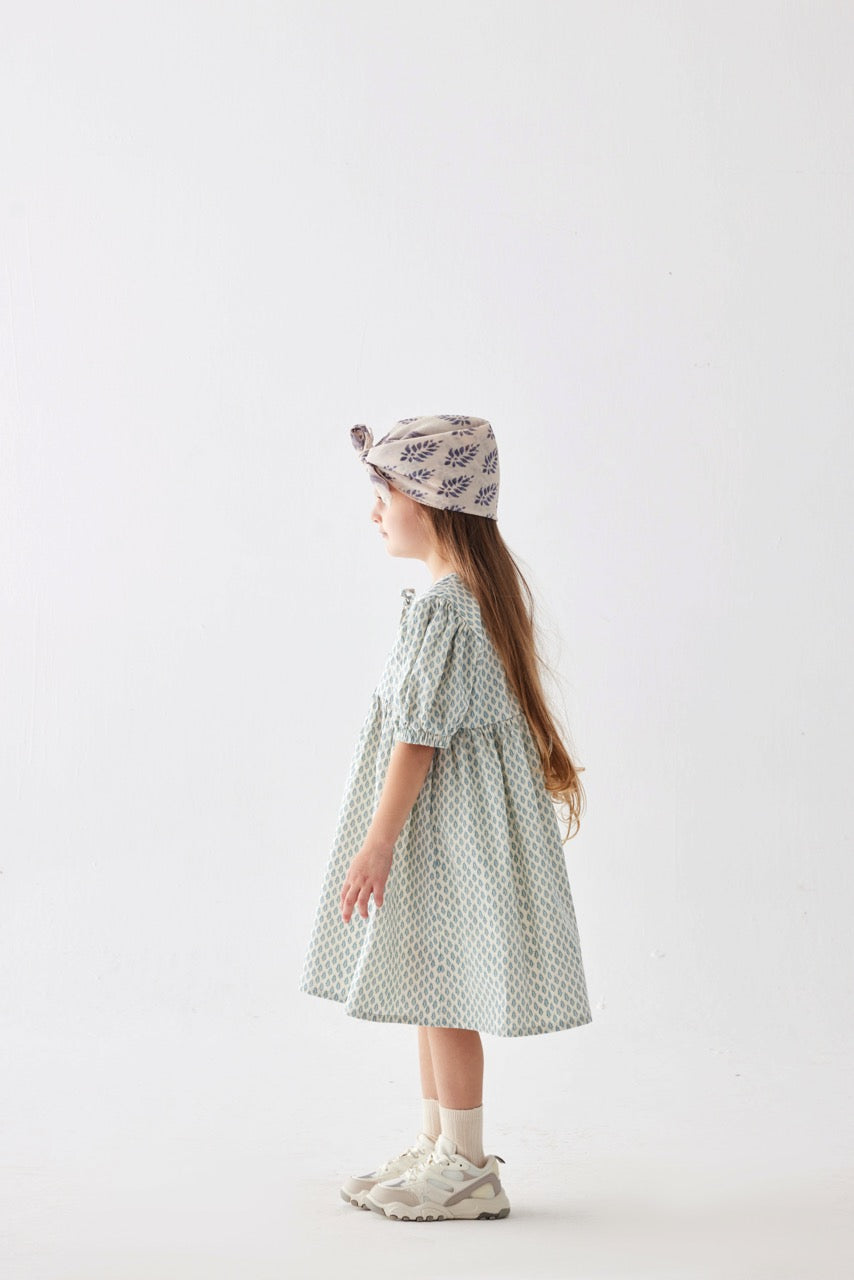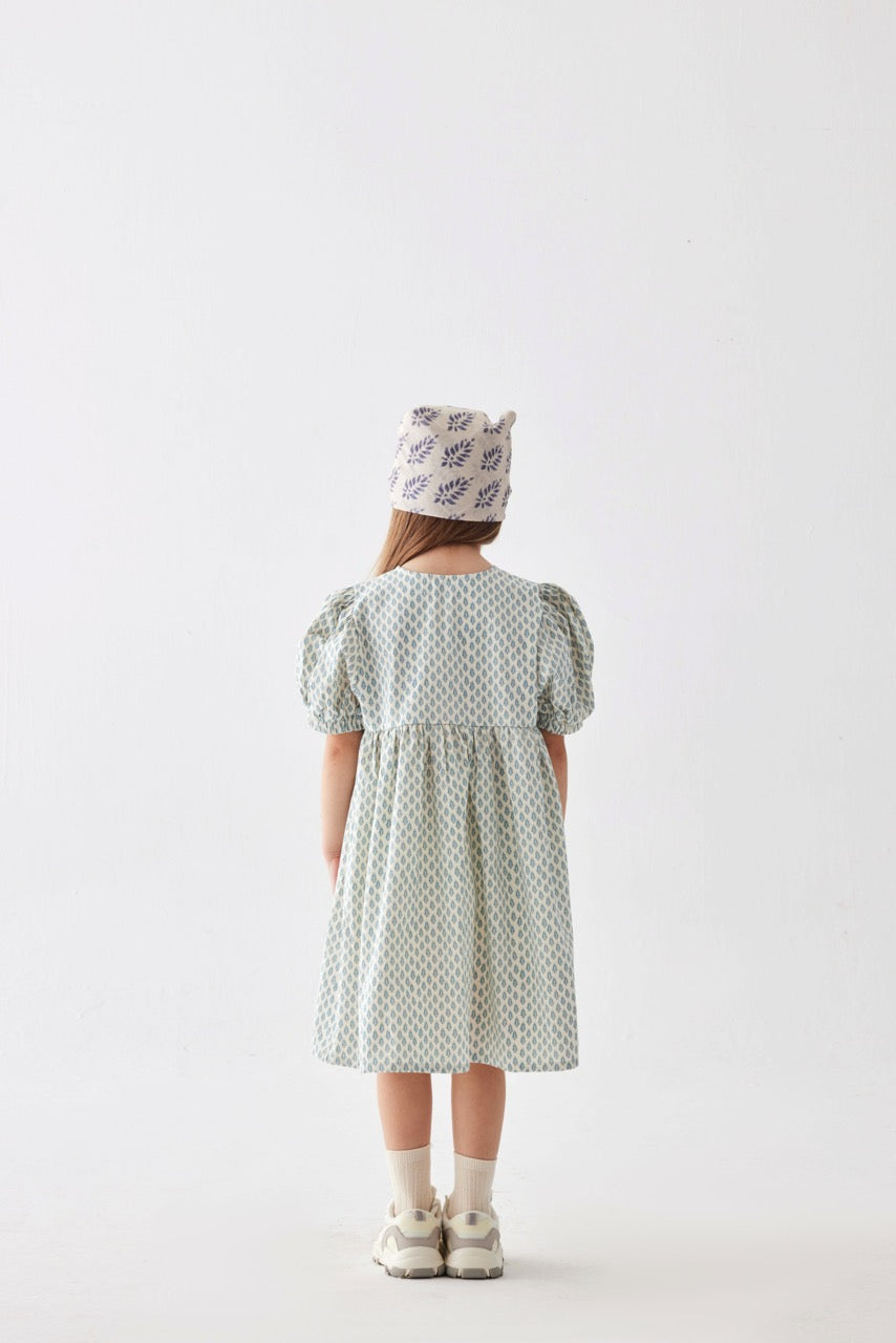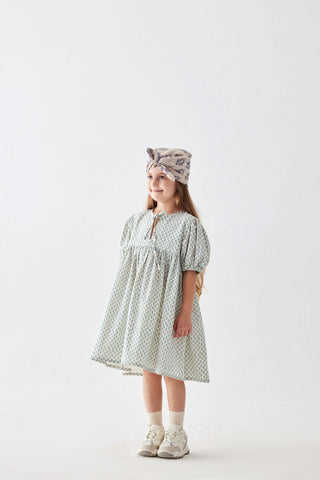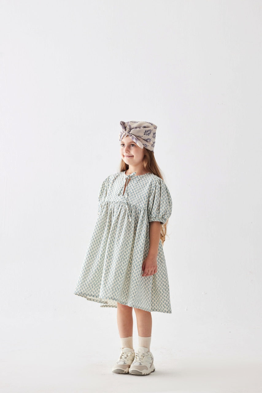 Bisiklet yaka, önden ip detaylı, lastik kenarlı kısa kollu , diz altı boy elbise.