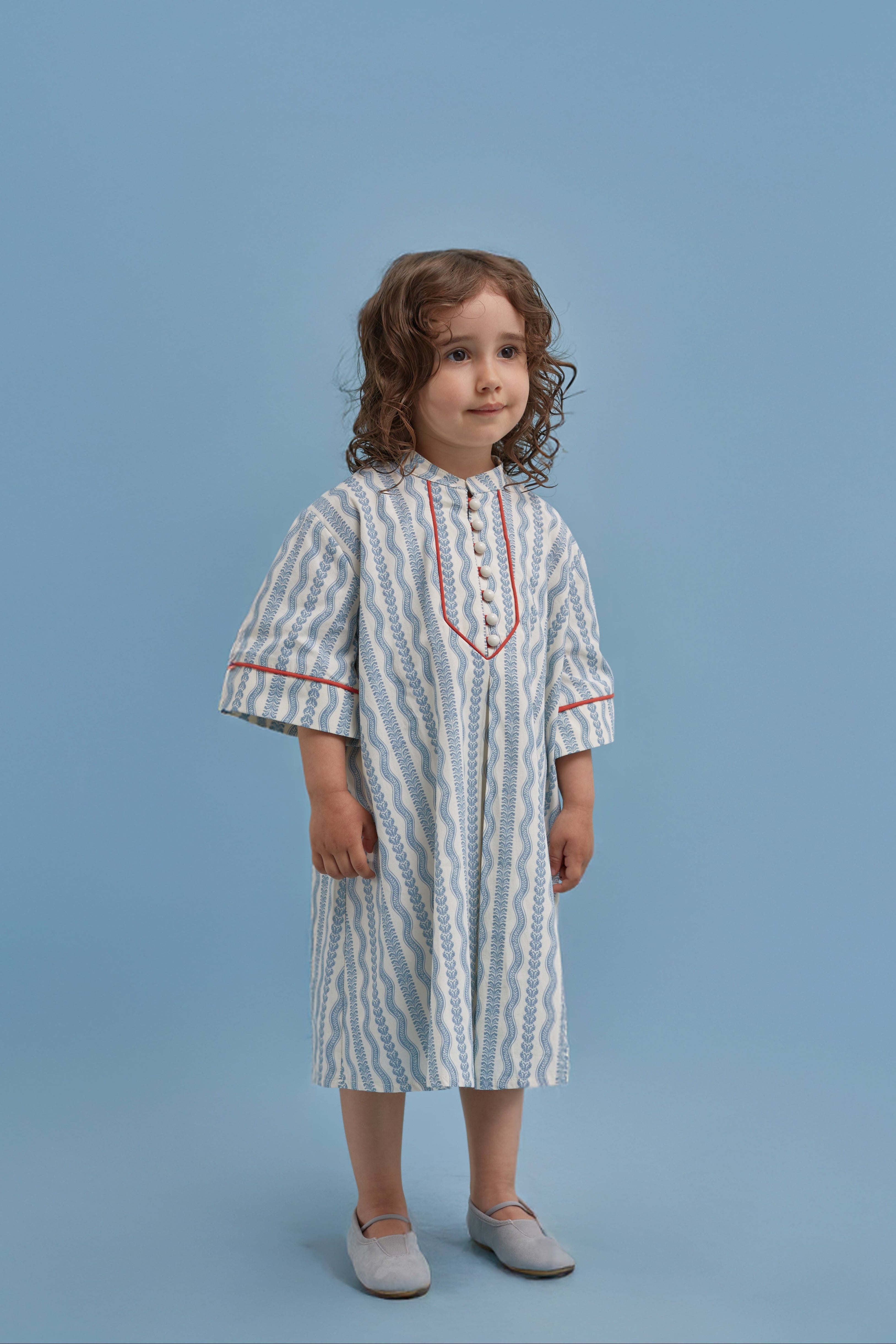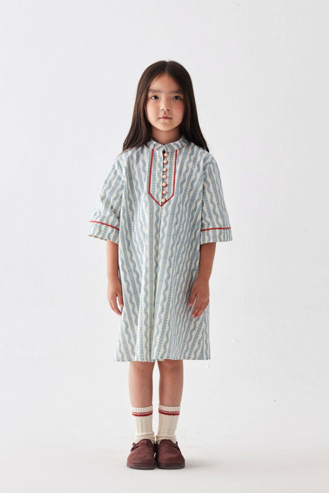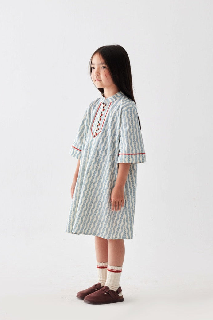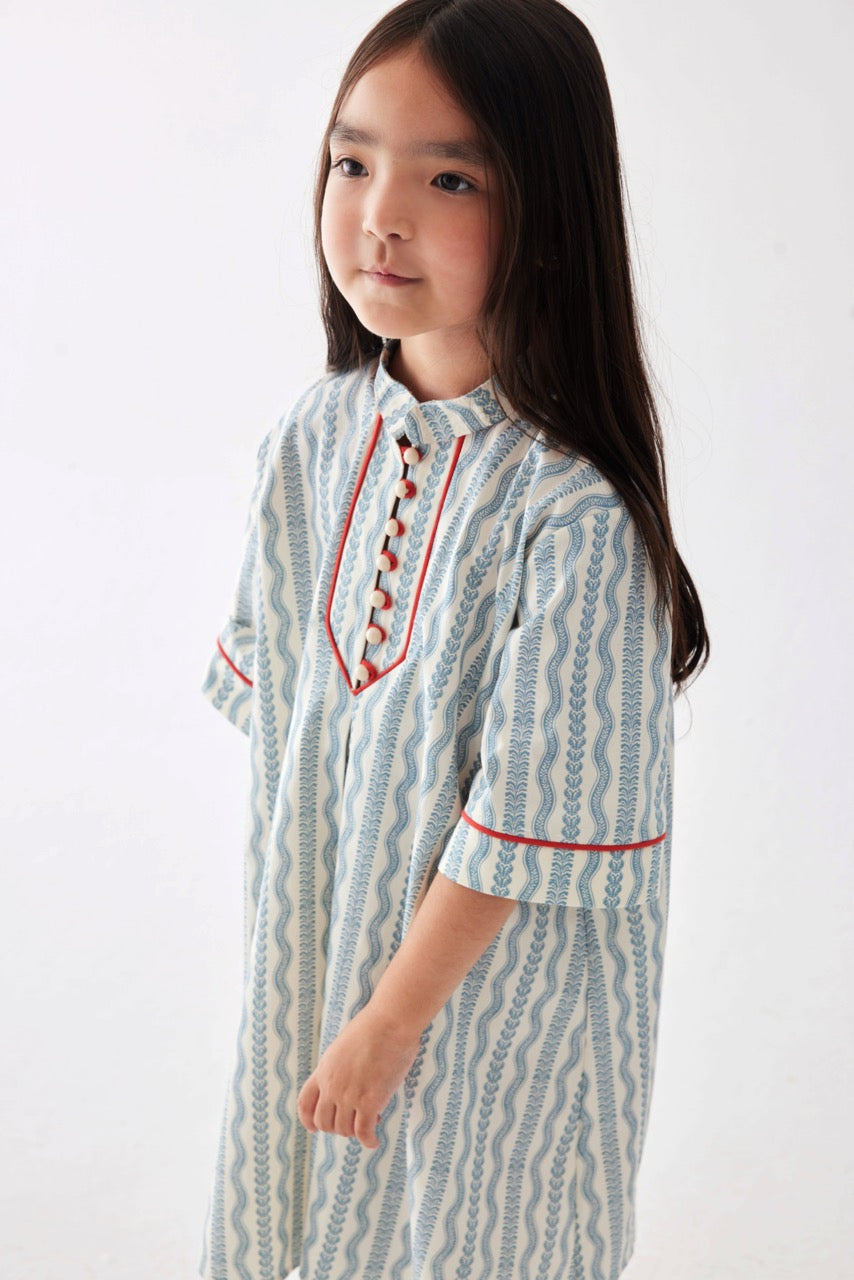 Özel desen baskılı, önden düğmeli, ön ve kol kırmızı biye detaylı, diz altı boy elbise.