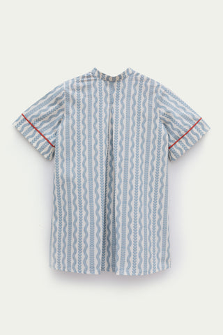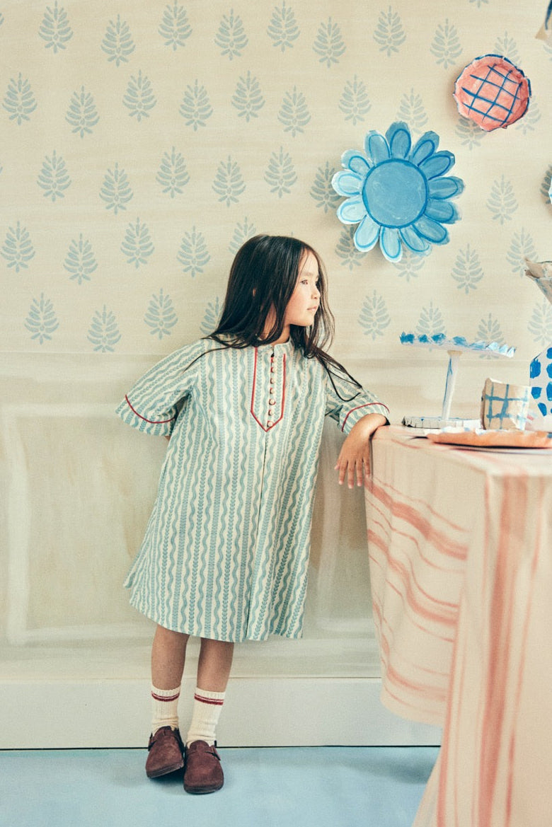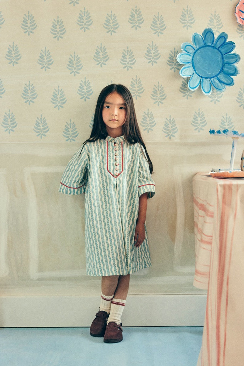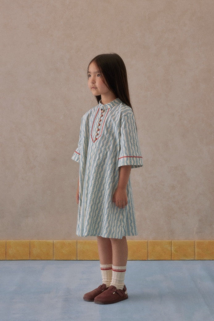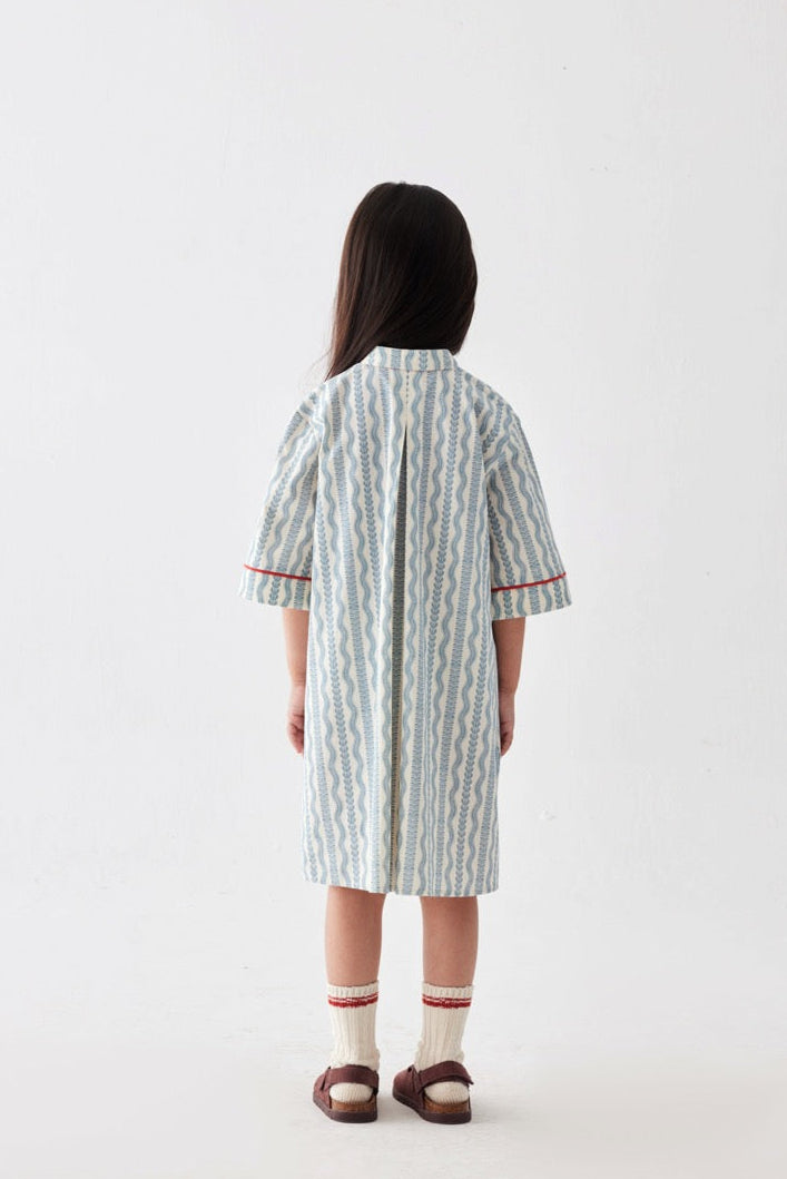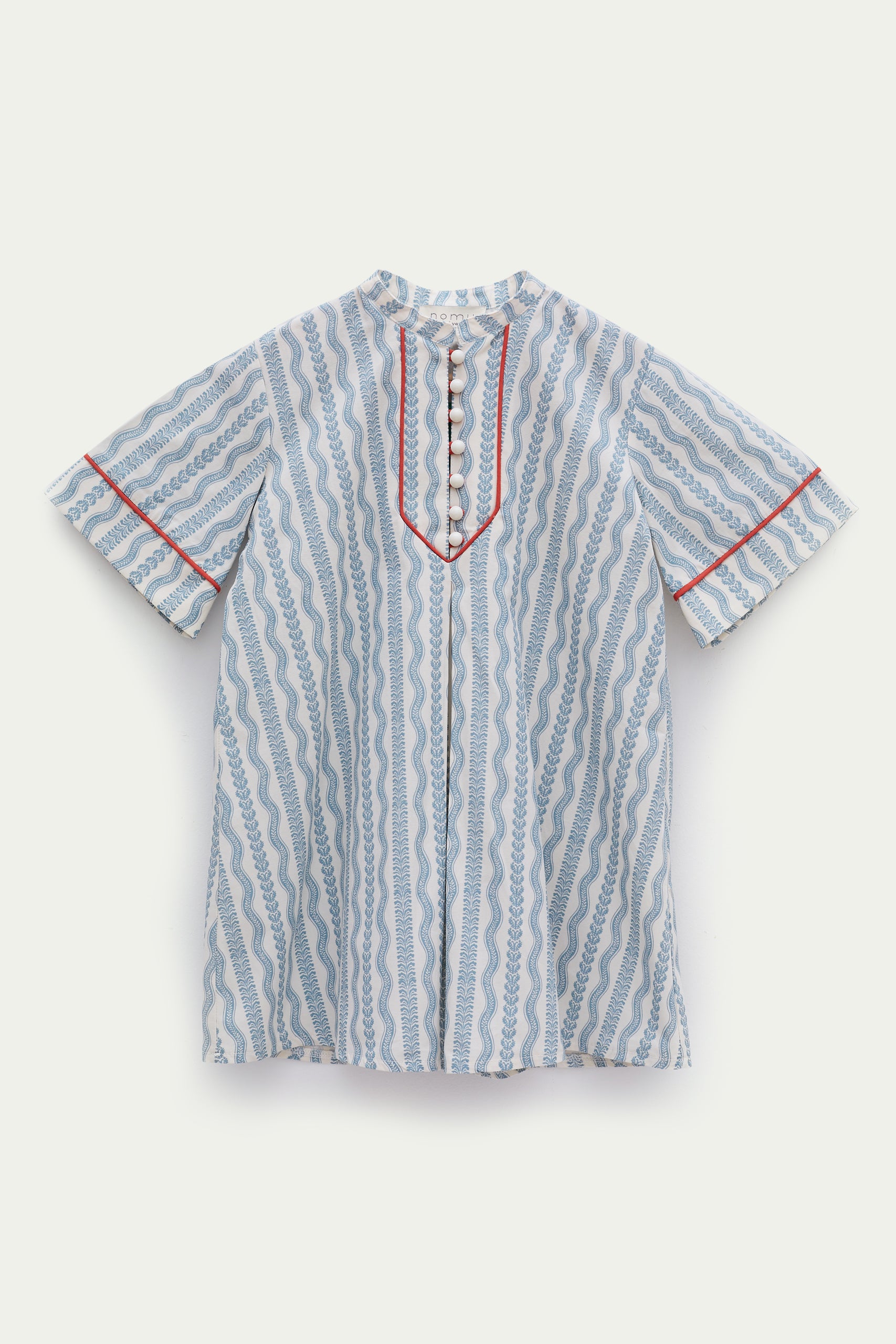 Özel desen baskılı, önden düğmeli, ön ve kol kırmızı biye detaylı, diz altı boy elbise.