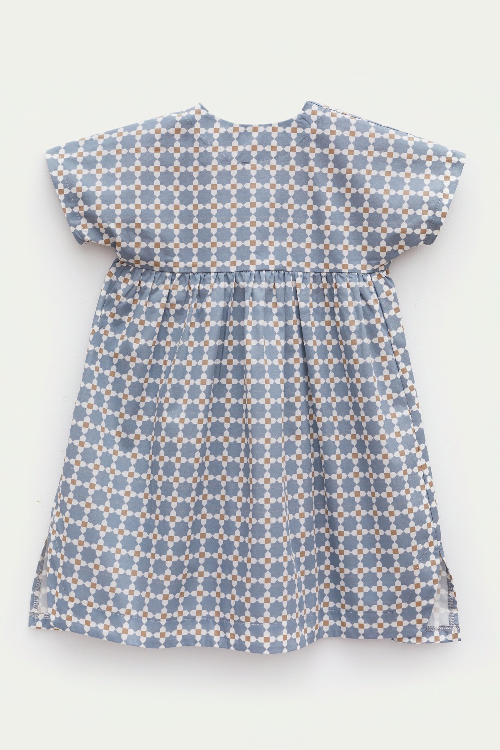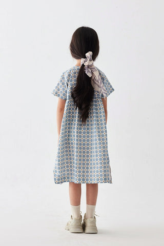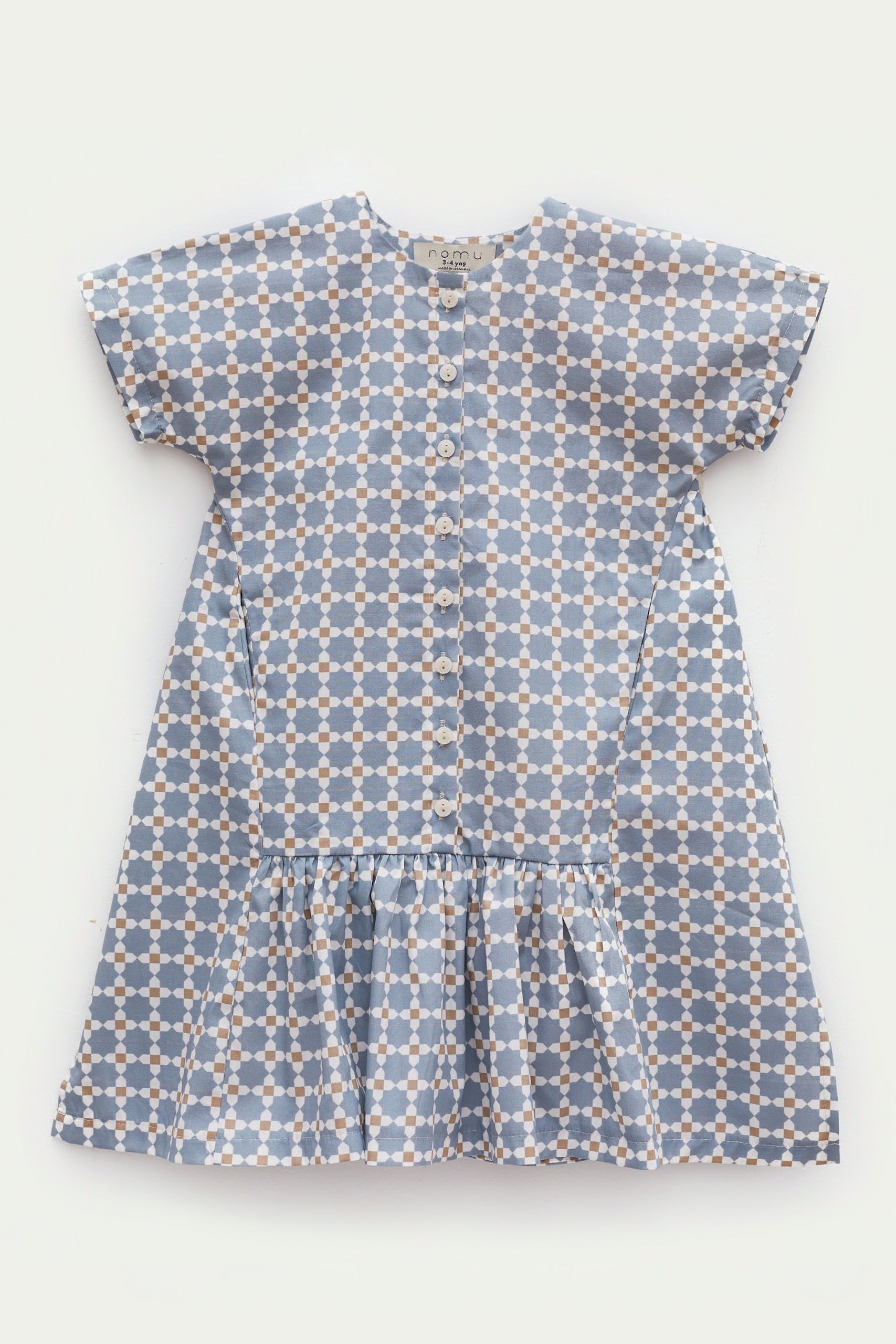 Oversize kalıp, önden düğmeli ve cepli, arka robası fırfırlı, özel tasarım desen baskılı, kısa kollu elbise.