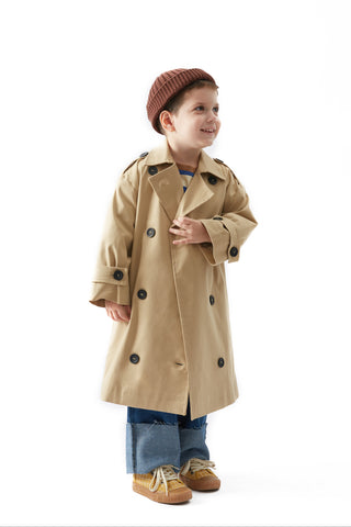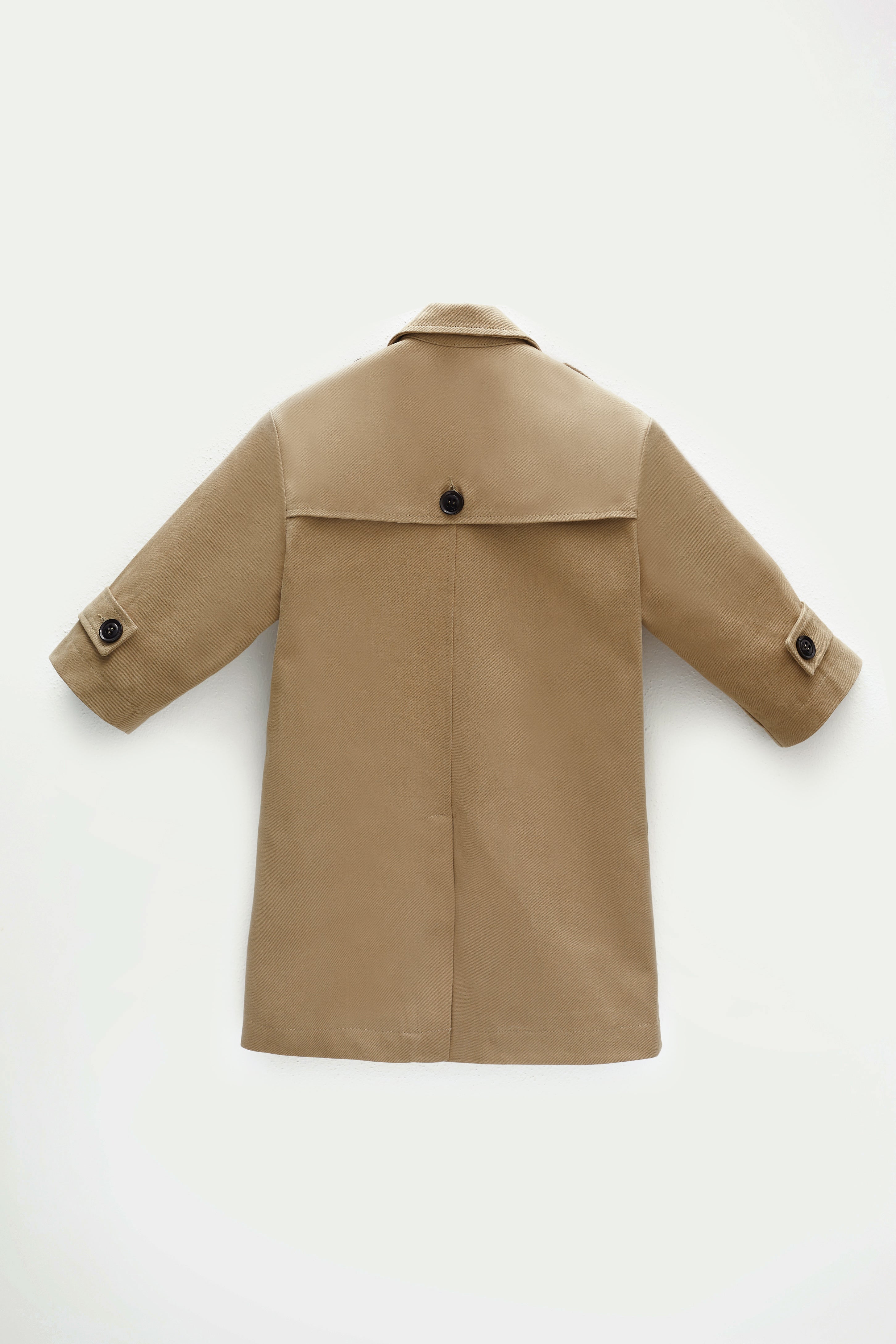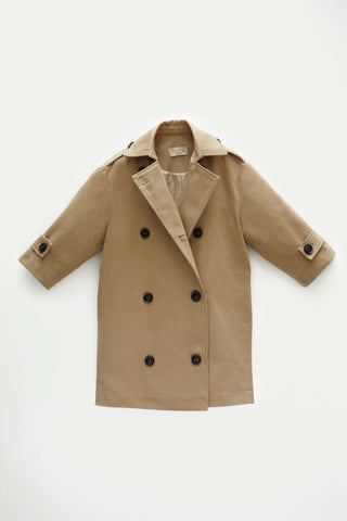 Oversize kalıp, kruvaze kapamalı, gömlek yakalı, omuzları apoletli, arkadan yırtmaçlı, astarlı trençkot.