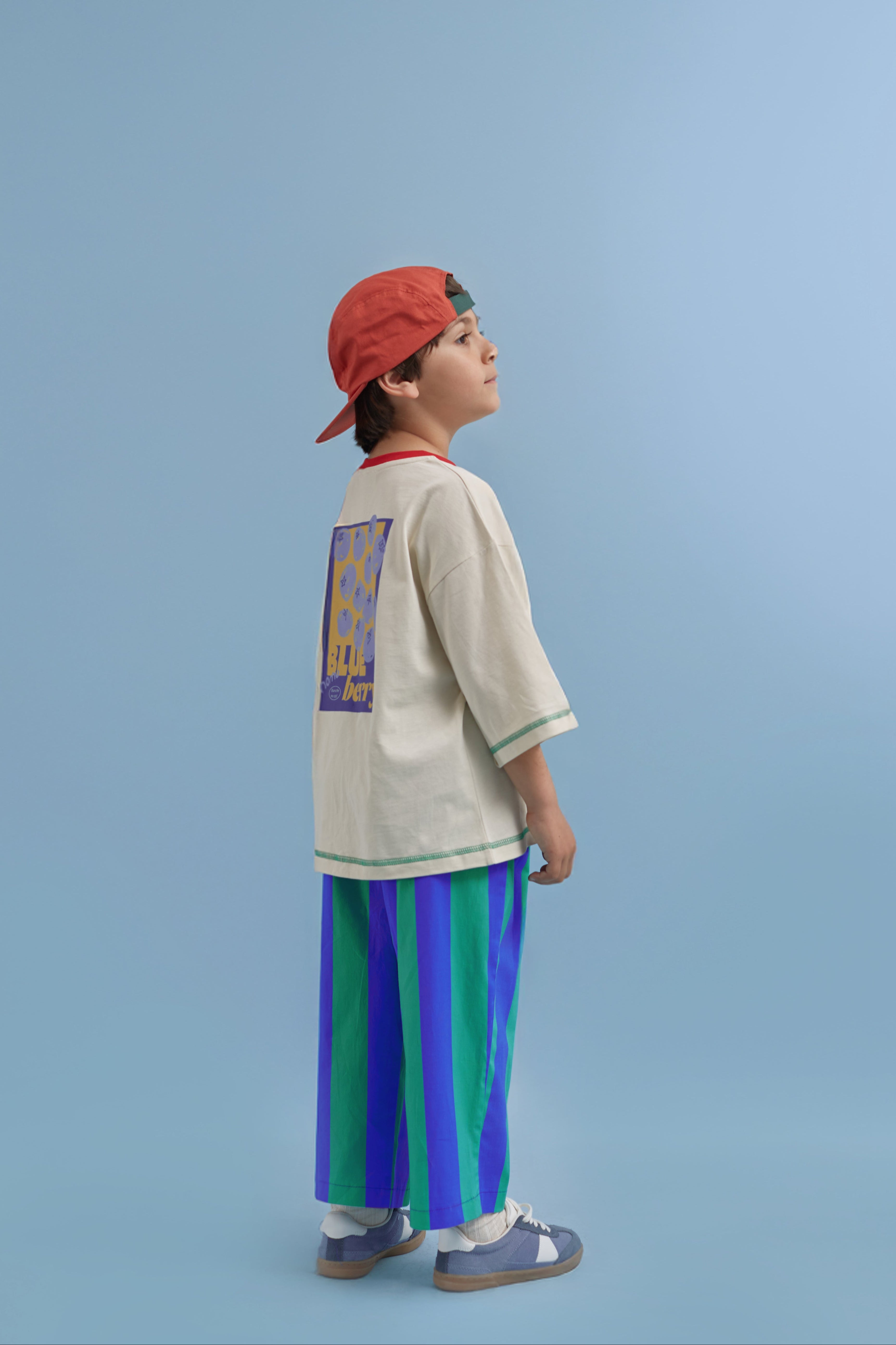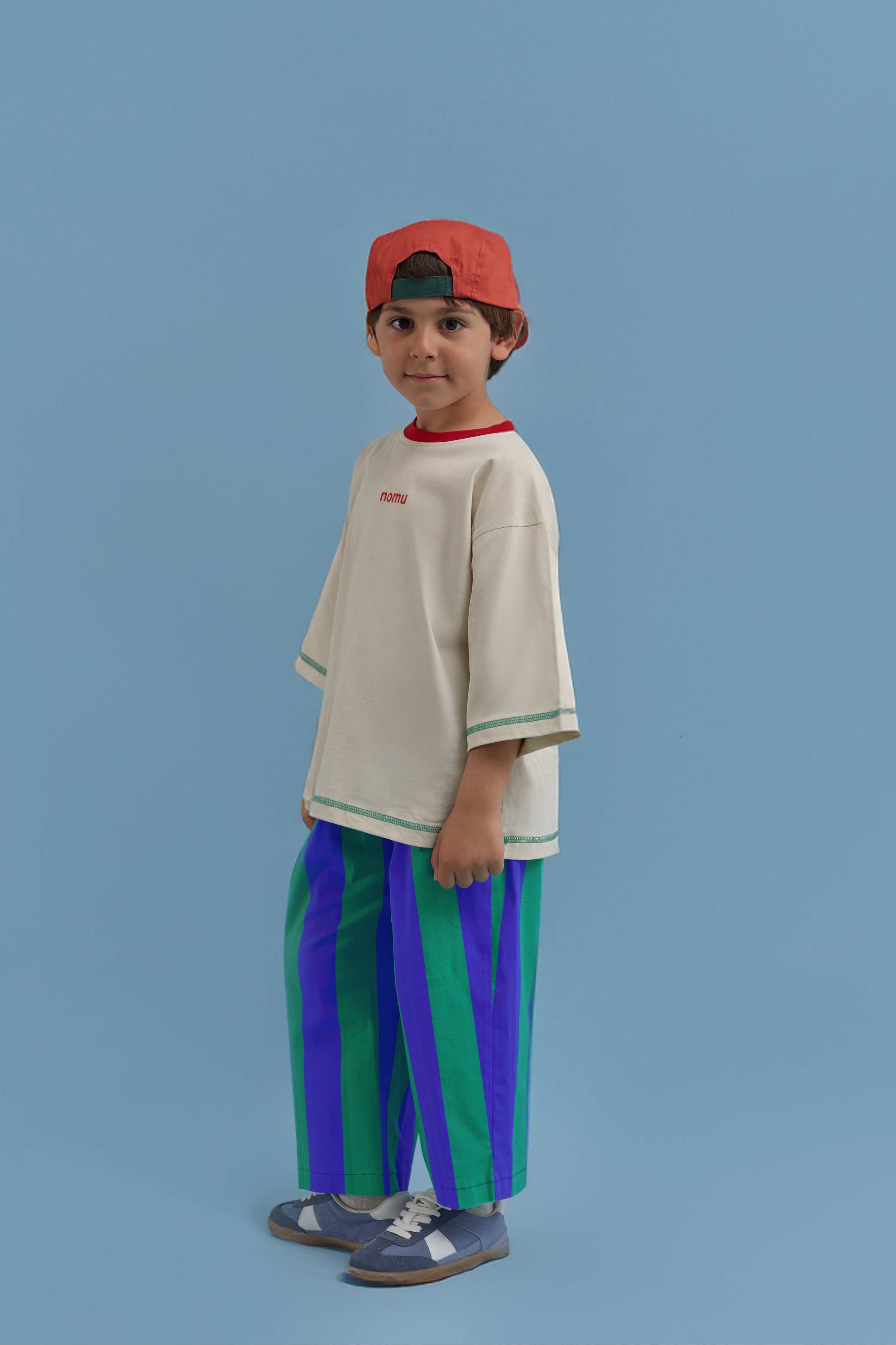 Çizgili desen, önü ayarlanabilir buzgü ipli, elastik belli, önden cepli pantolon.