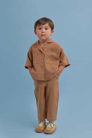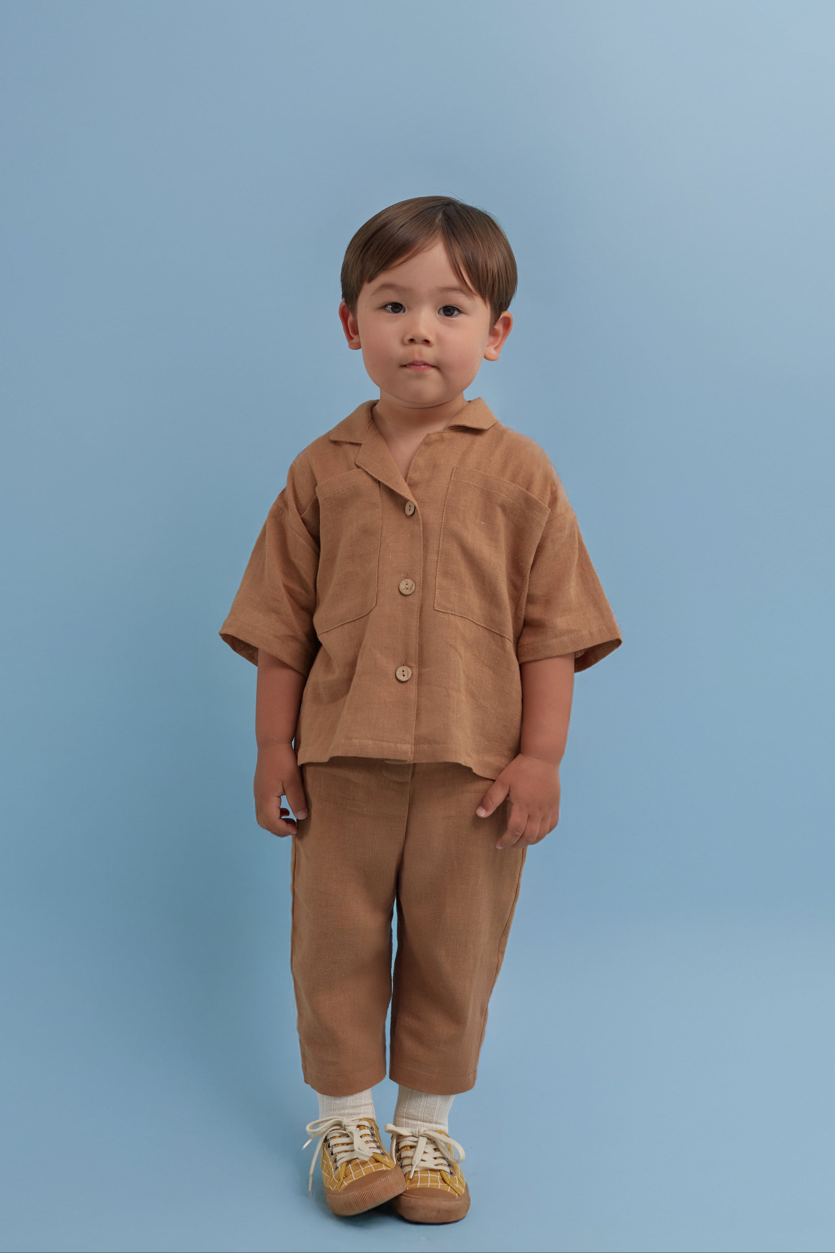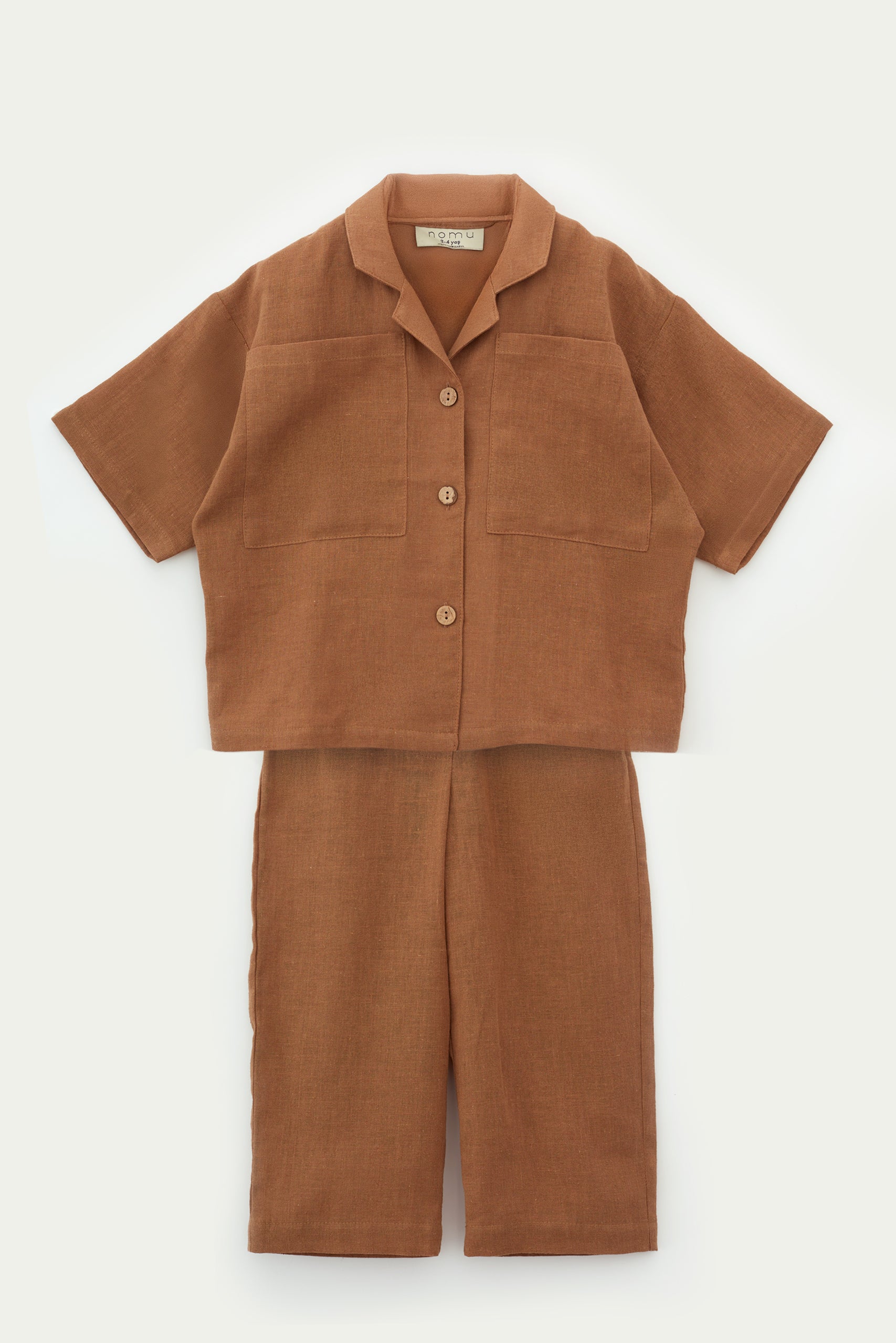 Oversize kalıp, gömlek yakalı, önden düğmeli, hafif ve rahat kumaş, ikili takım.