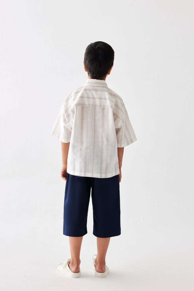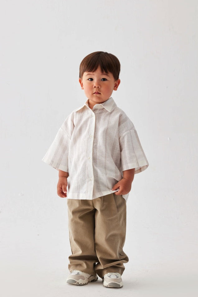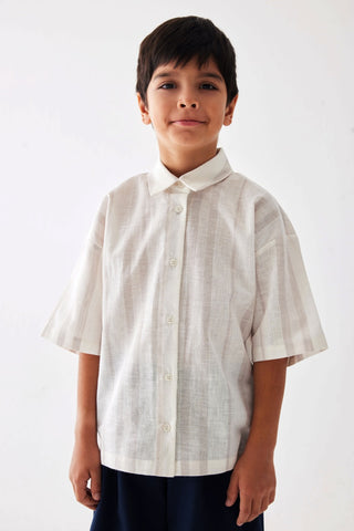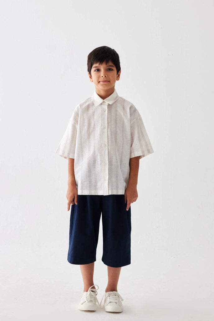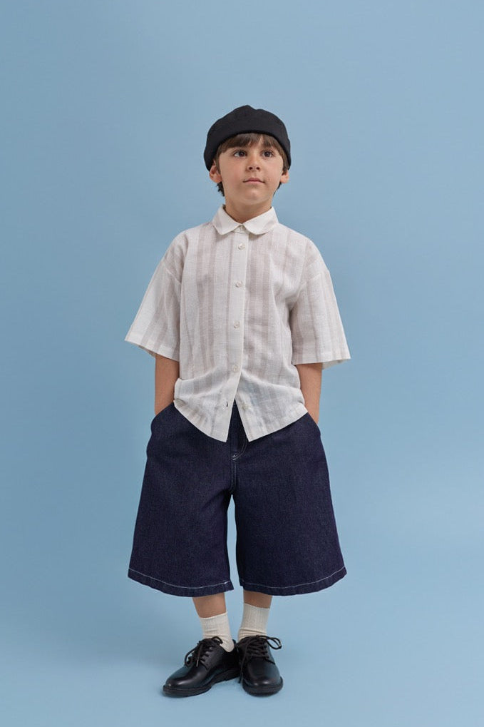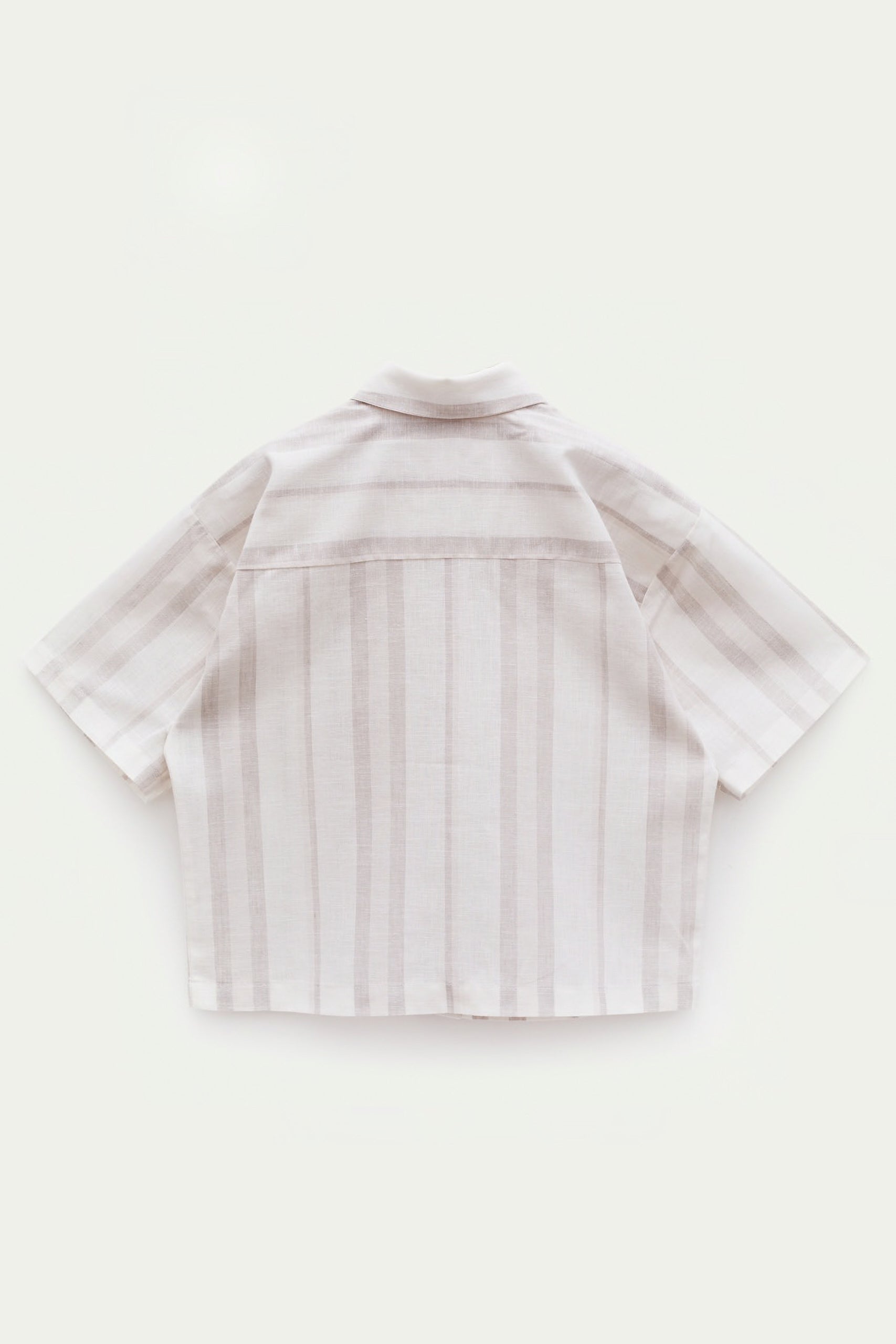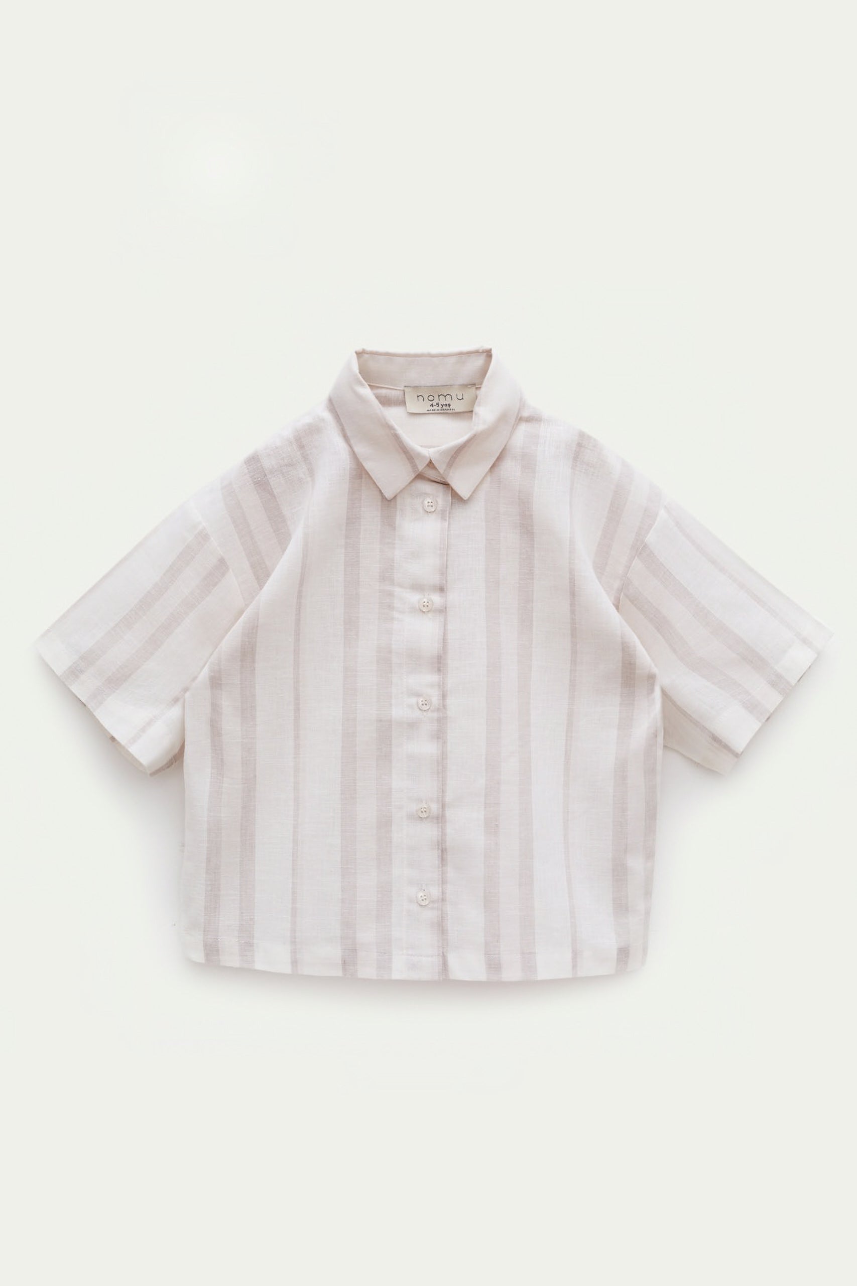 Oversize kalıp, doğal çizgi desenli, gömlek yakalı, önden düğmeli, kısa kollu gömlek.