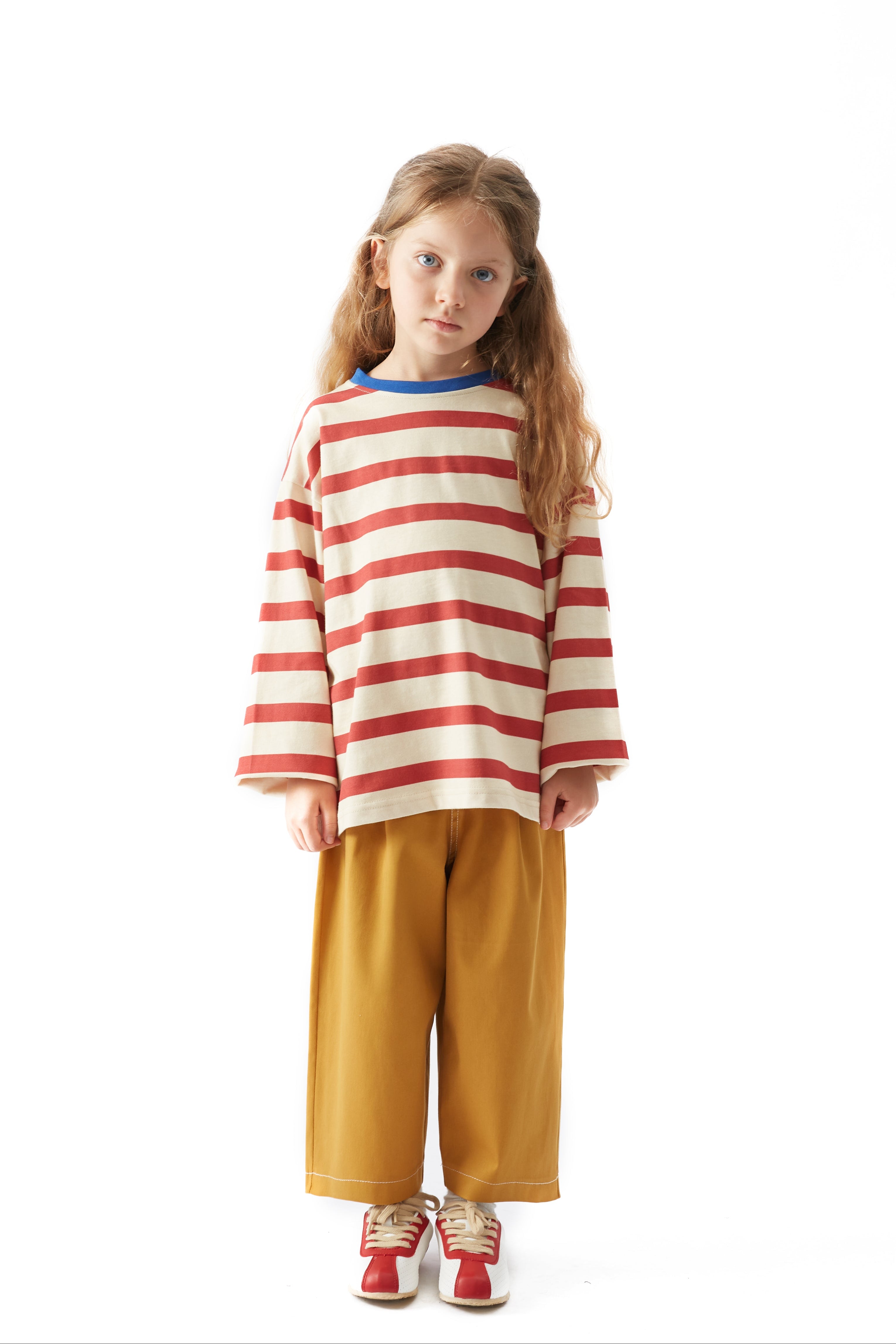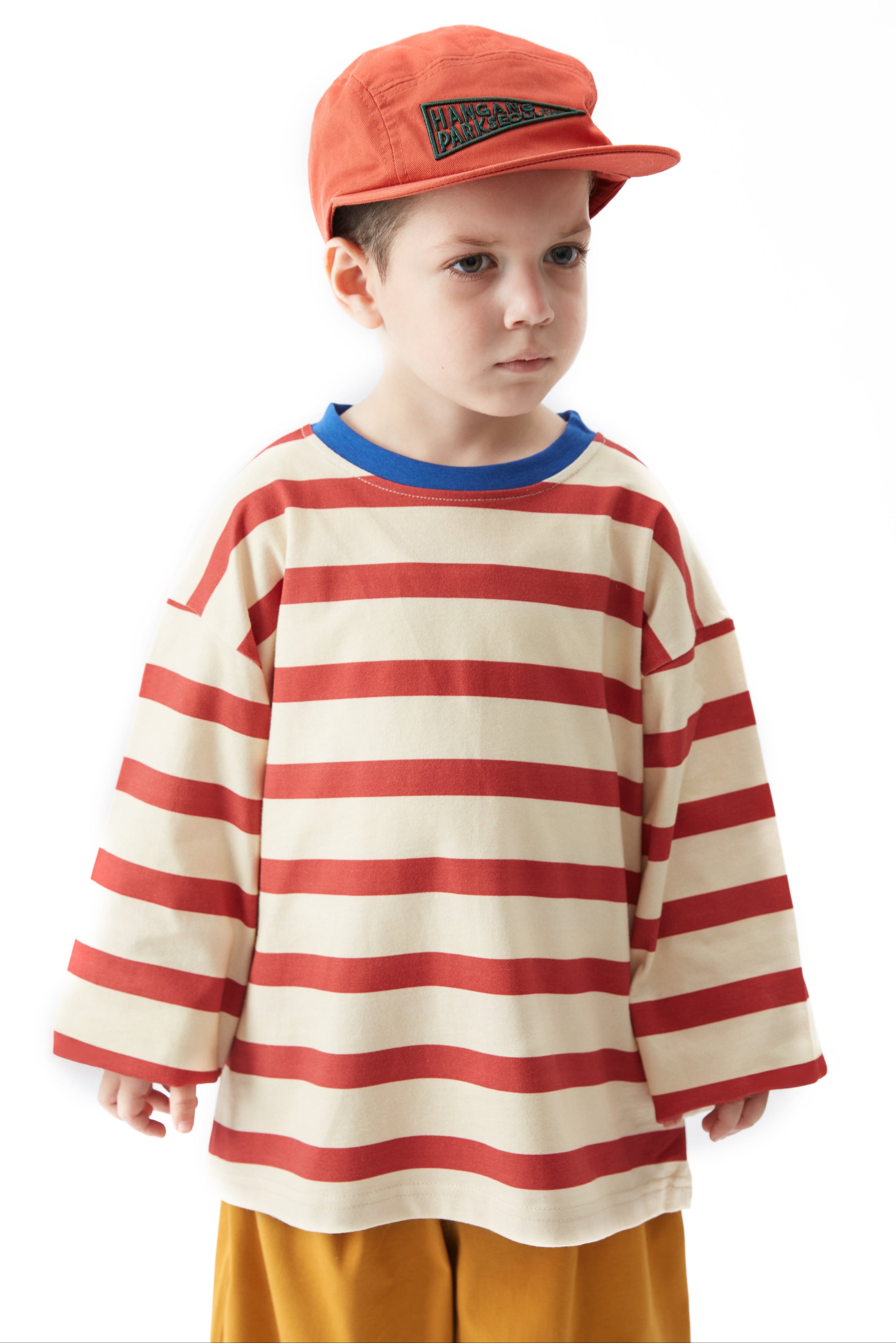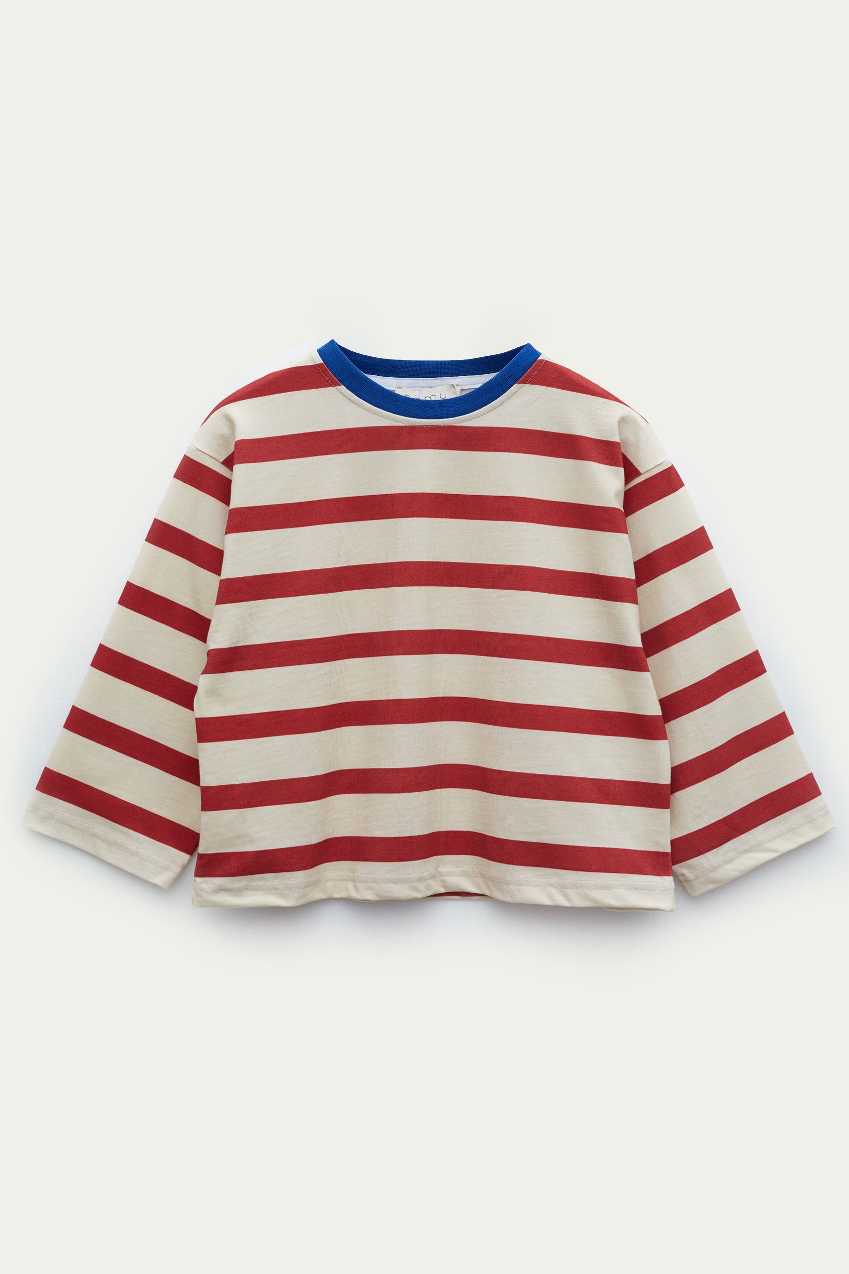 Oversize ve salaş kalıp, çizgi desen, bisiklet ve ribana yakalı, uzun kollu tişört.