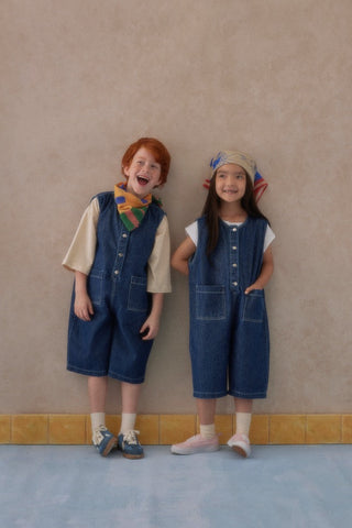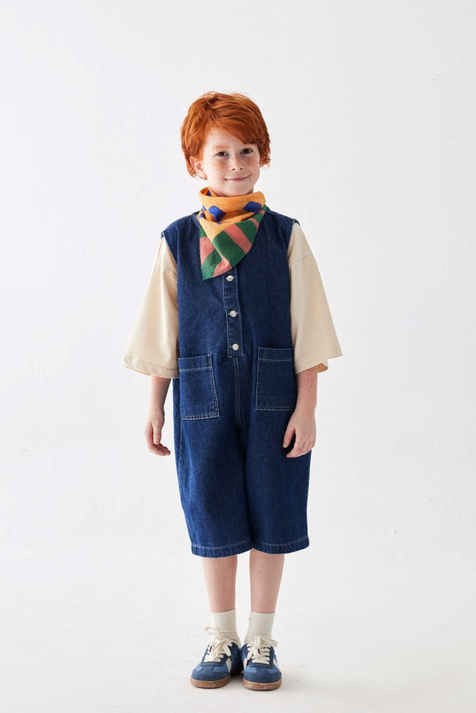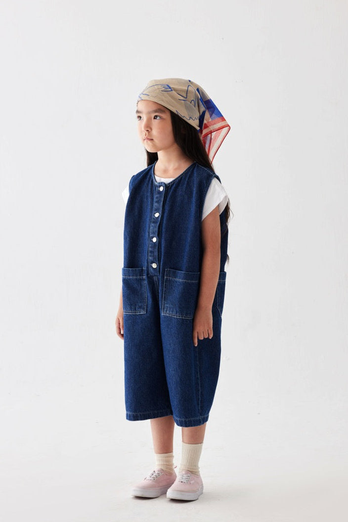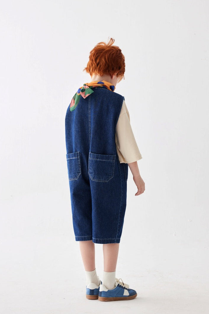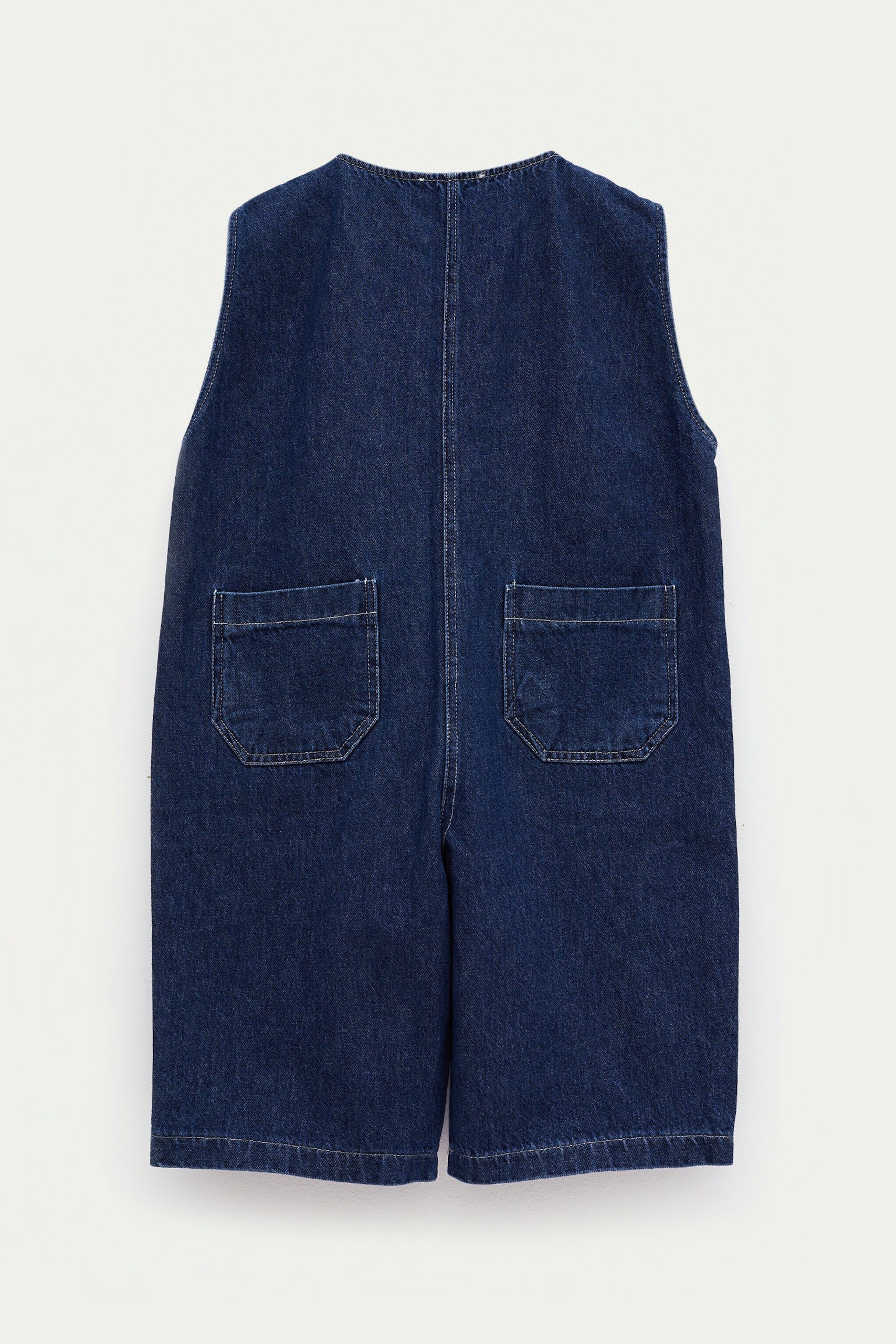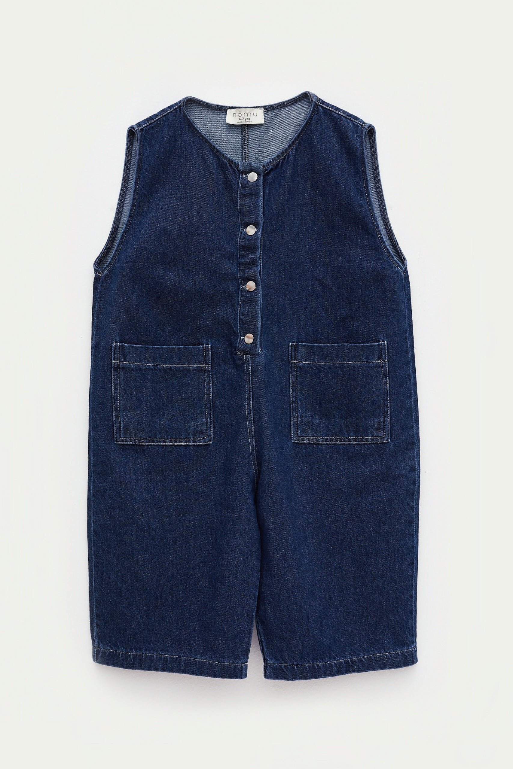 Oversize ve salaş kalıp, düşük ağ model, kolsuz, önden düğmeli rahat tulum.