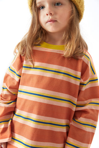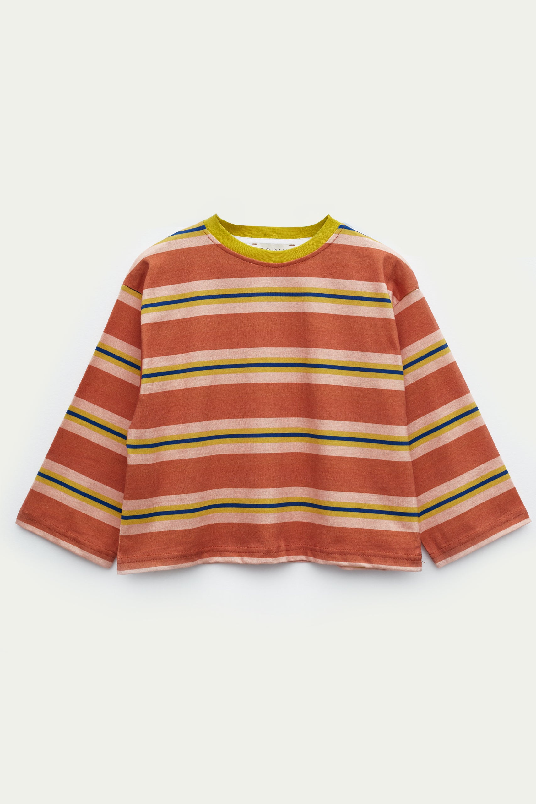 Oversize ve salaş kalıp, çizgi desen, bisiklet ve ribana yakalı, uzun kollu tişört.