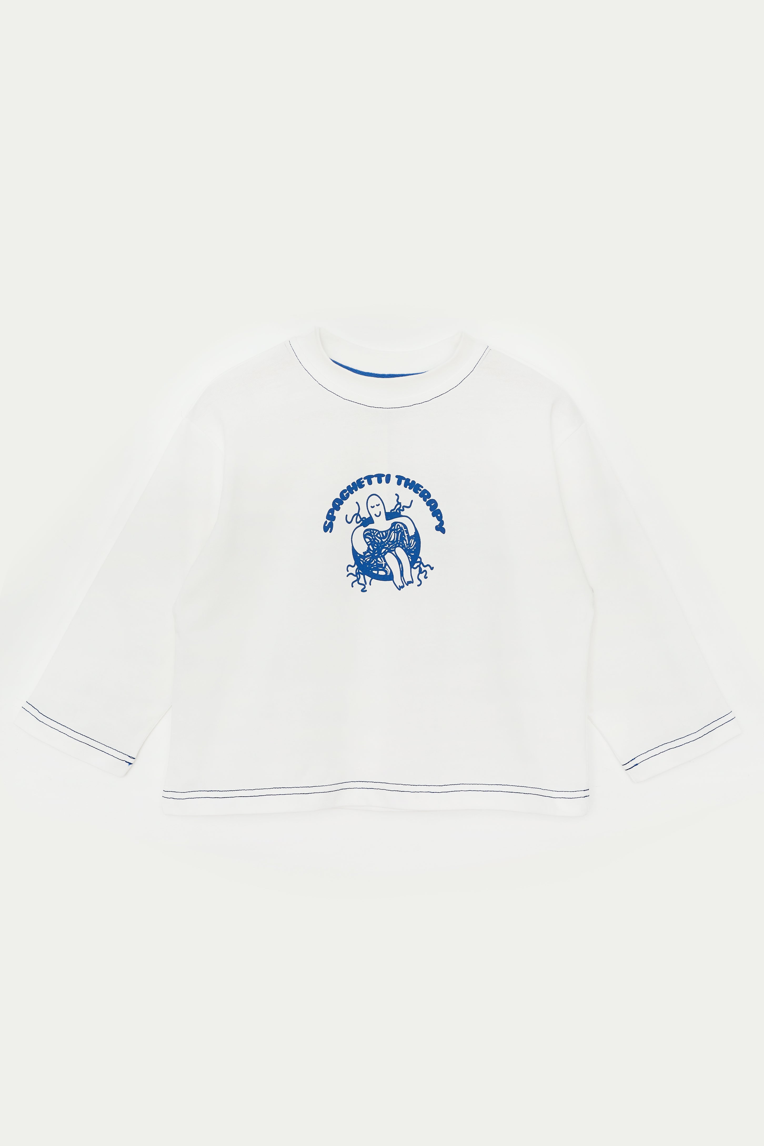 Oversize kalıp, bisiklet yakalı, tasarım baskı desenli, kontrast dikişli, uzun kollu tişört.