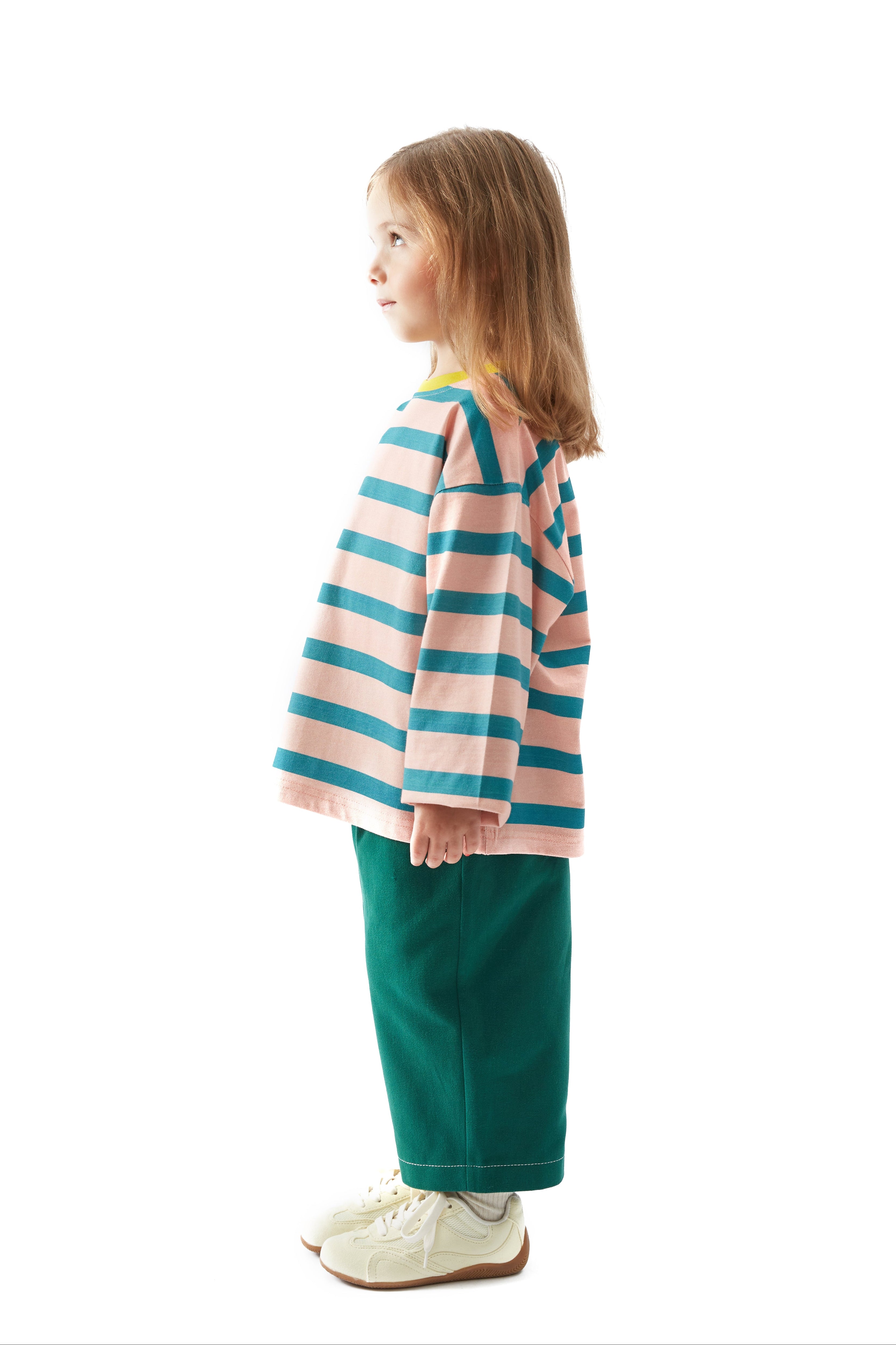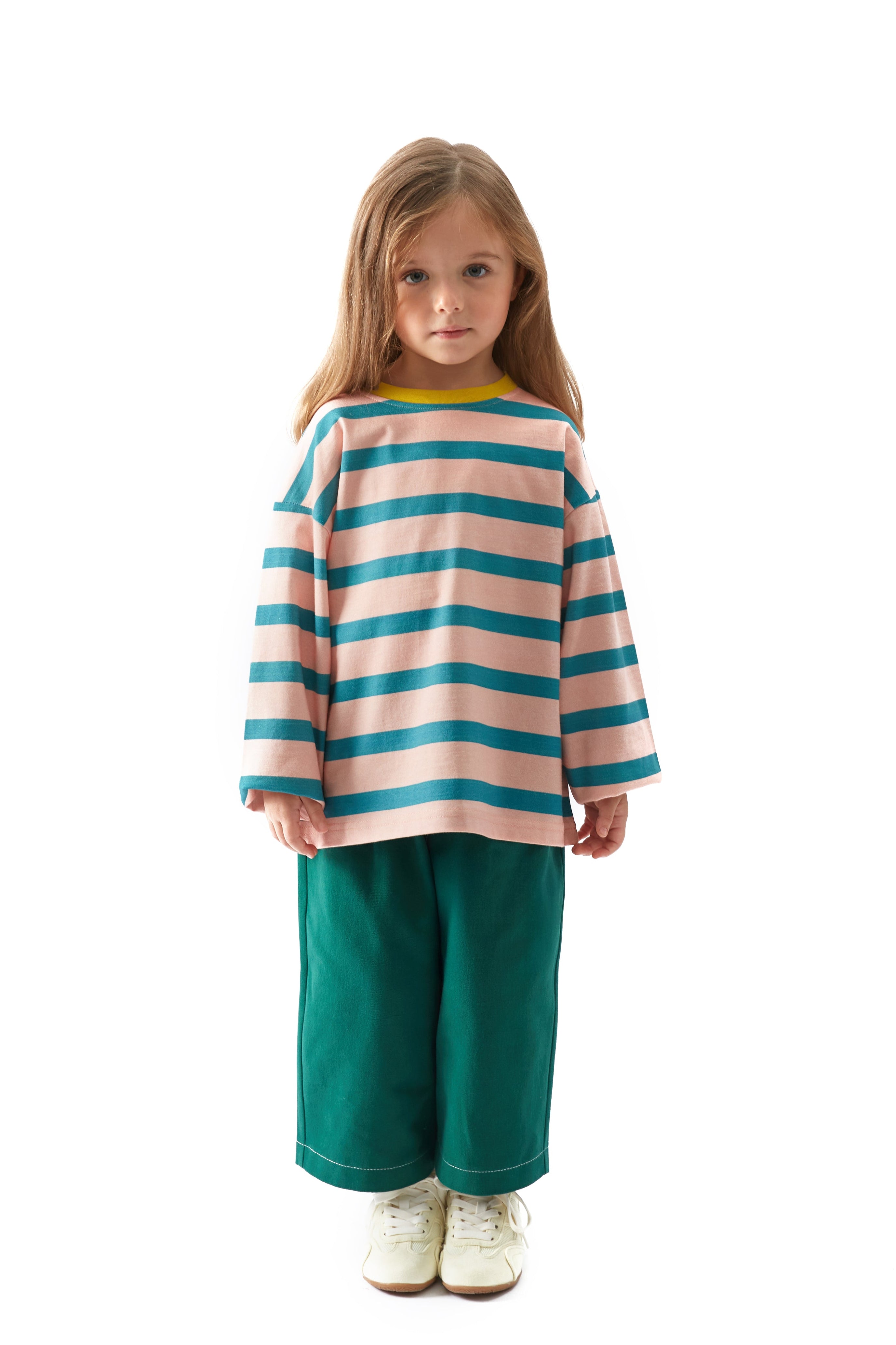 Oversize ve salaş kalıp, çizgi desen, bisiklet ve ribana yakalı, uzun kollu tişört.